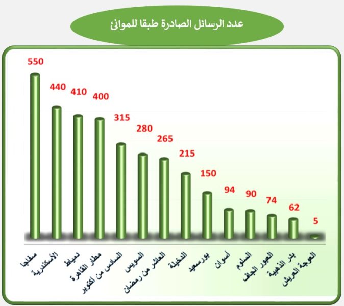 ولا يزال ميناء سفاجا يحتل المركز الأول في عدد الرسائل الغذائية المصدرة منه بإجمالي 550 رسالة، يليه ميناء الإسكندرية بـ 440 رسالة، ثم ميناء دمياط بإجمالي 410 رسالة.